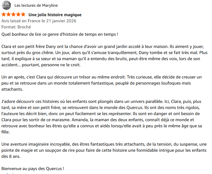 Clara va alors découvrir que cet arbre centenaire, dans la famille depuis des générations, abrite un monde merveilleux, celui du peuple des Quercus. Ces derniers l’ont appelée à l’aide pour les épauler dans leur lutte contre les sanguinaires Maringouins, leurs ennemis de toujours. Et la petite fille a bien l’intention de répondre à leur appel de détresse.